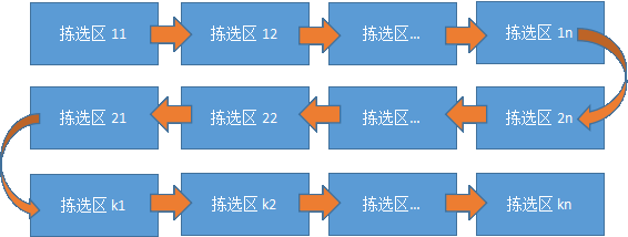 而對(duì)串行揀選來(lái)說(shuō),揀選是從一個(gè)統(tǒng)一的點(diǎn)發(fā)起的,依次完成所有揀選任務(wù)。示意圖如下: