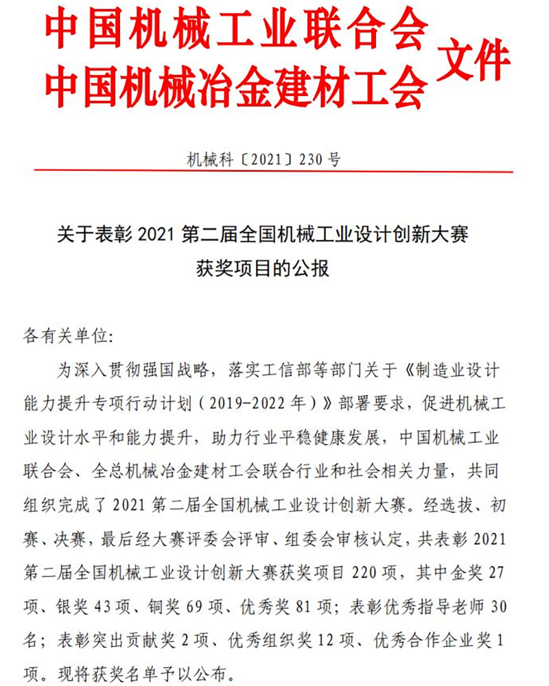 近日,由中國機械工業(yè)聯(lián)合會、中國機械冶金建材工會聯(lián)合相關行業(yè)和社會力量共同舉辦的“2021第二屆全國機械工業(yè)設計創(chuàng)新大賽”圓滿落幕。經(jīng)過選拔、初賽、決賽的激烈角逐,由紅蟹團隊設計的“紅蟹四通穿梭”產(chǎn)品獲得銅獎!